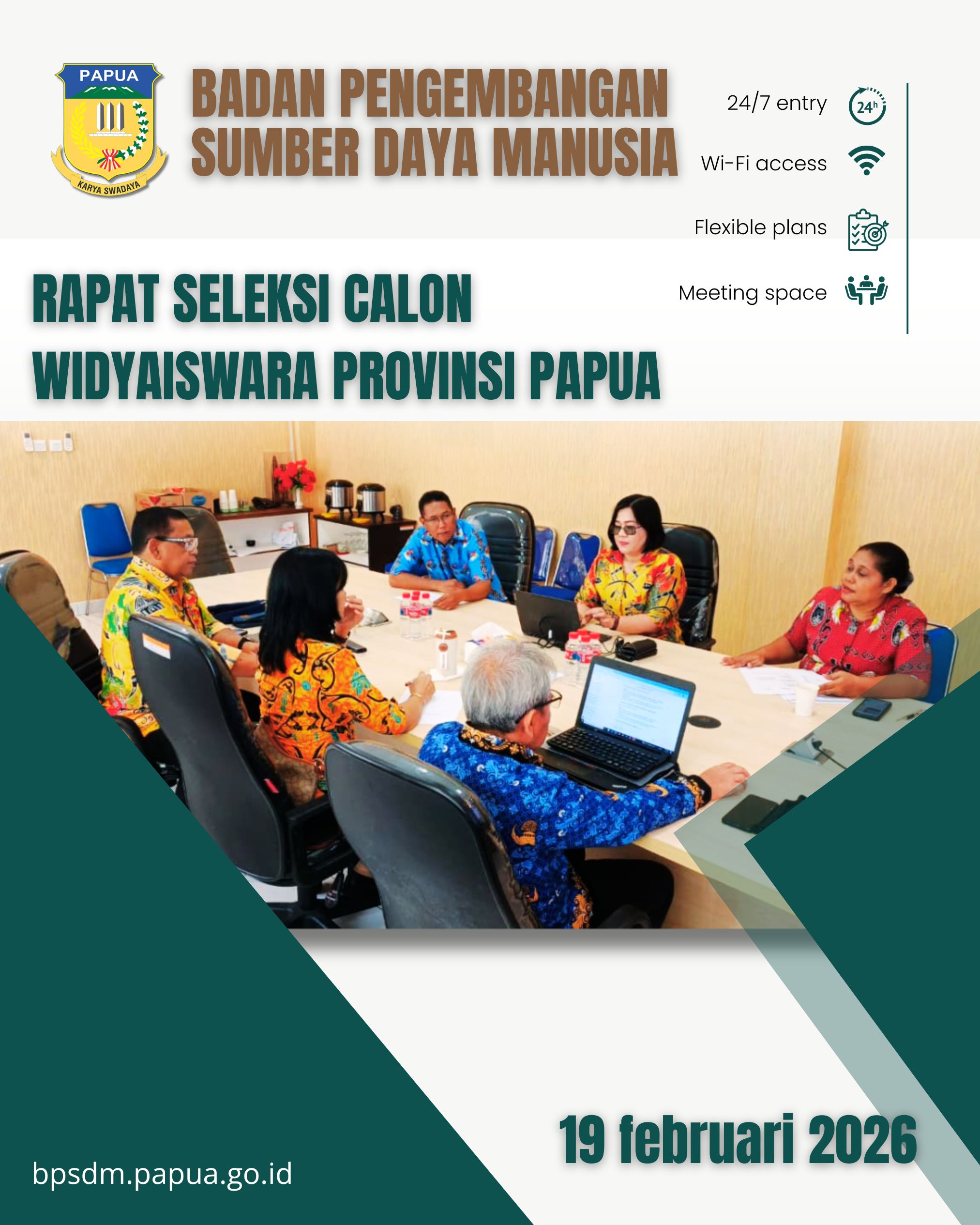 Selamat datang di website Badan Pengembangan Sumber Daya Manusia Provinsi Papua. Sebagai garda terdepan dalam pengembangan aparatur, kami berkomitmen untuk membangun SDM yang profesional, berintegritas, dan berorientasi pelayanan dengan mengedepankan core value ASN BerAKHLAK (Berorientasi Pelayanan, Akuntabel, Kompeten, Harmonis, Loyal, Adaptif, dan Kolaborati). Semoga website ini menjadi sumber informasi yang bermanfaat bagi seluruh ASN dan masyarakat. Read More